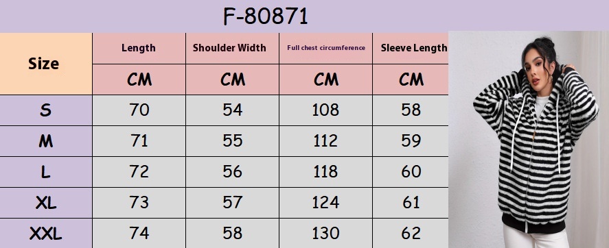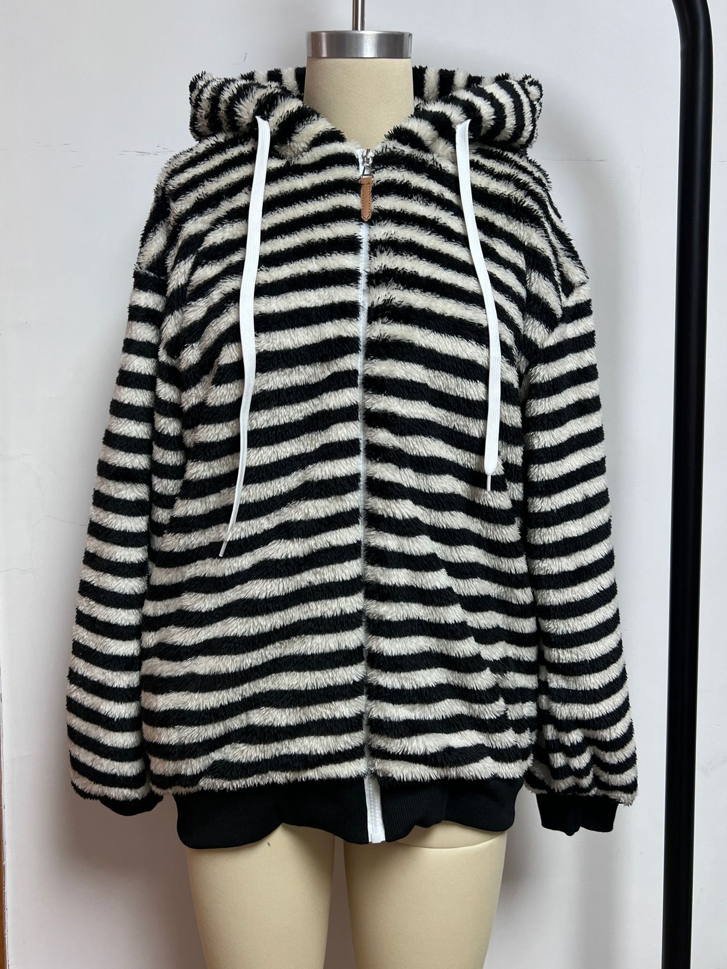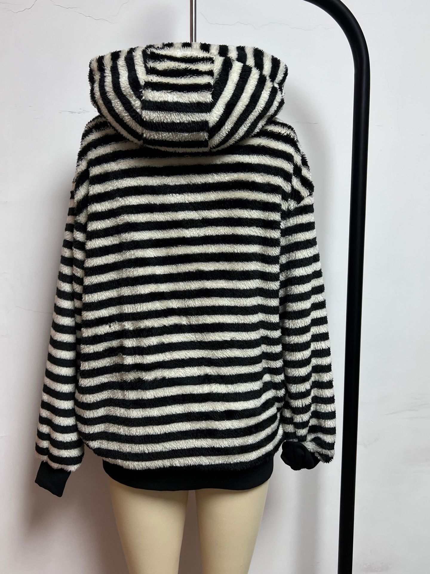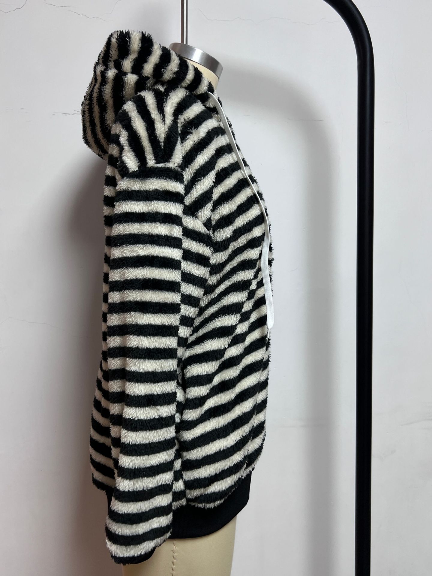 New Lazy Plush Design Black And White Striped Hooded Jacket