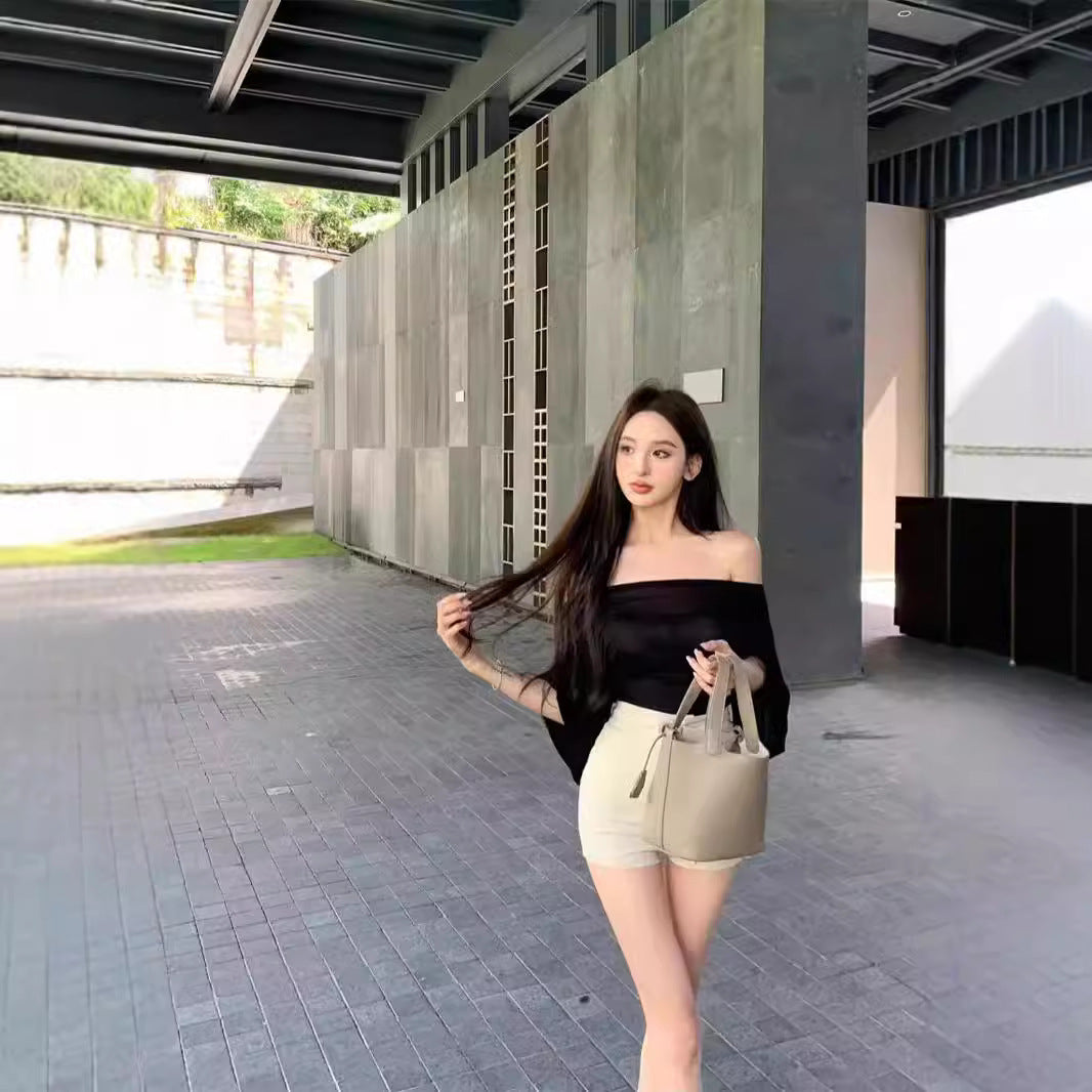 Off-neck Blue T-shirt Women's Summer Tight Waist Slimming And Shoulder Hollow Top