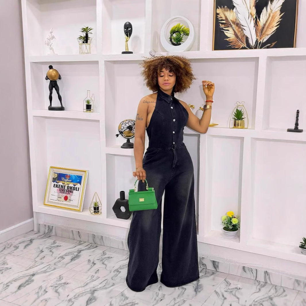 Women's Casual Single-breasted Backless Denim Jumpsuit